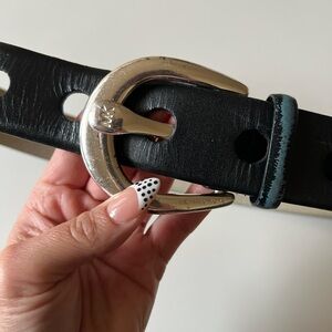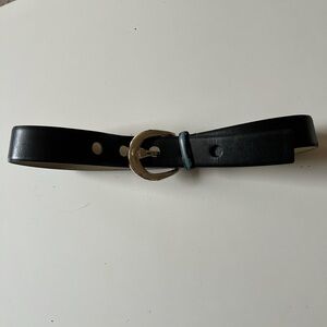 Chic black leather belt with a stylish gold buckle. Ideal for enhancing any outfit.