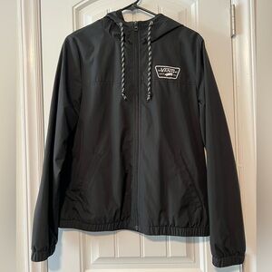 Vans windbreaker with drawstring hood. Features front zipper and logo detail.