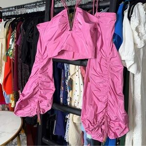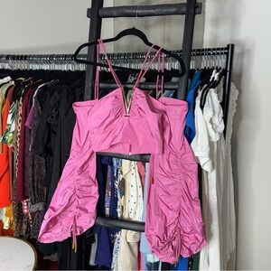 Bold, architectural, and glamorous — the Benazir Top by Silvia Tcherassi is a true statement piece. Crafted from luxe rose taffeta, this off-the-shoulder design features dramatic ruched puff sleeves, a plunging V-wire neckline with halter tie closure, and an exposed back zipper for a modern edge. The structured silhouette sculpts the body while the voluminous sleeves balance femininity and strength, creating an unforgettable high-fashion look. Made in Colombia, this top embodies Silvia Tcherassi’s signature balance of playful color and couture-level tailoring.