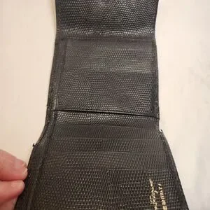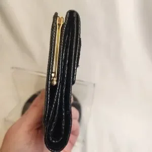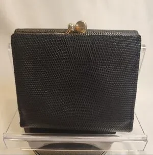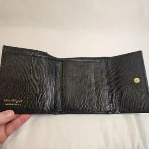 Salvatore Ferragamo Vara bifold wallet in black, featuring the brand's signature grosgrain Vara bow and gold-tone hardware. The wallet is crafted from lizard-embossed calf leather. It is in good pre-loved condition with minimal signs of wear. Please see photos for condition! She is gorgeous and in great condition especially for a vintage wallet!