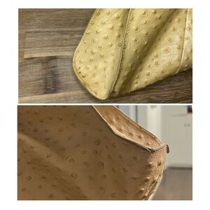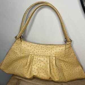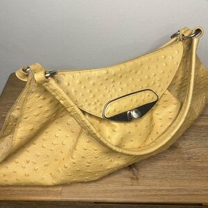 Furla popular women’s genuine butter yellow Shoulder Bag. Embossed Ostrich Leather made in Italy with silver twist latch.