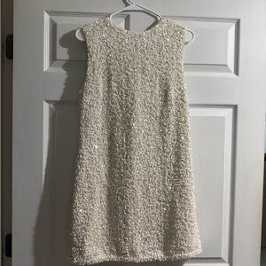 Elegant cream mini dress. Features shimmering sequins. Perfect for special occasions.