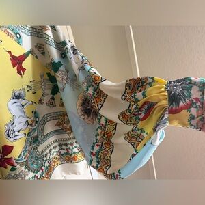 Silk blouse with intricate multicolor patterns. Features floral and geometric designs.