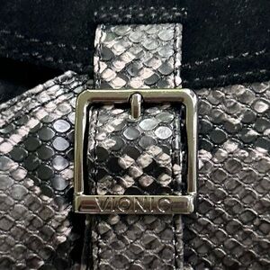 • Suede and faux snake-print, water-resistant, V-notch collar, side zip, metallic buckle detail