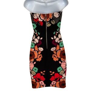 Captivate with this stunning Express strapless bodycon dress, a vibrant canvas of bold floral artistry. The form-fitting silhouette beautifully accentuates your figure, while the striking print bursts with rich oranges, deep reds, soft pinks, and cool teals against a classic black background. A silver zipper closure at the back adds a touch of modern polish to this eye-catching design.