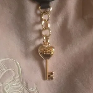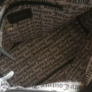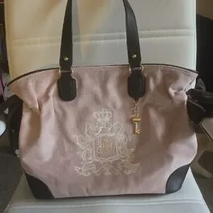 Elegant Juicy Couture tote with blush and black tones. Features intricate embroidery and key charm. Ideal for daily style.
