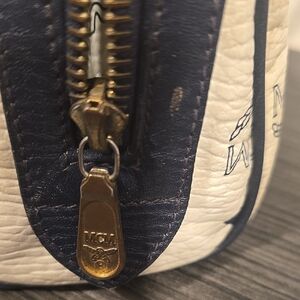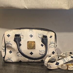Stylish MCM **mini Boston ** women's bag in white with black/blue accents. Perfect for any occasion.