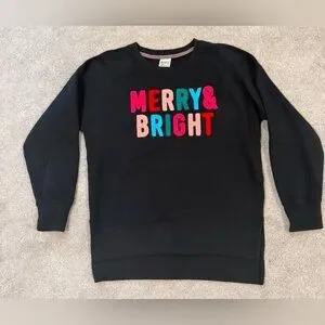 Women’s Black Sweatshirt with 'Merry & Bright' Text, size Large, Royce Brand. Worn once. Longer length style. Smoke free home.