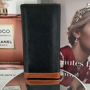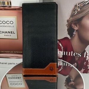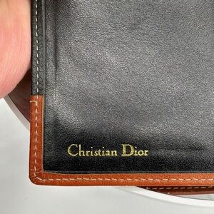 DIOR Vintage Cardholder. This sleek cardholder is finely crafted of black leather with contrasting brown leather accents. The front features an embossed Dior logo, adding a subtle signature touch. The interior includes a transparent PVC ID slot and multiple compartments, all lined in black leather.