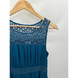 Blue knee length sleeveless dress. Sheer lace inset, smocked elastic back, lined.