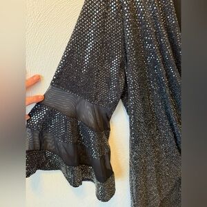R&M Richards dress, R&M Richards 16W, plus size cocktail dress, plus size evening dress, NWT formal dress, black silver dress, sparkle glitter dress, shimmer party dress, faux wrap dress, draped front dress, rhinestone buckle dress, V neck cocktail dress, wedding guest dress plus, holiday party dress, New Years Eve dress, formal event dress, ruffle sleeve dress, sheer sleeve dress, tiered sleeve dress, glittery dress plus size, curvy occasion dress, sparkle gown, metallic sparkle dress, fancy dinner outfit, cocktail attire, mother of the bride dress, mother of the groom dress