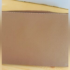New without tag. Coach leather wristlet in a warm saddle brown hue. This versatile zip pouch features a secure zippered closure and a convenient wrist strap for easy carrying. The interior offers space for essentials like cards and small personal items. Perfect for a quick errand, a night out, or as an organizer within a larger bag.