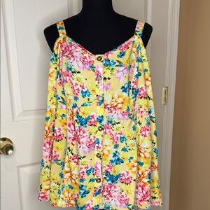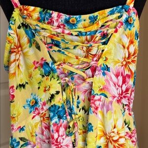 Vibrant floral design with button-down front. Features pink, blue, and yellow flowers. Perfect for a stylish look.