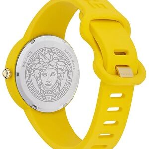 Bracelet: Yellow silicone strap with 3D Medusa; 3D Versace lettering; Tongue buckle