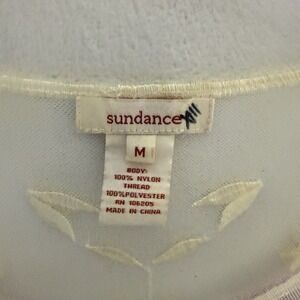 Sundance white sheer embroidered top. Blue and red Aztec embroidery. Short sleeve shirt. Nylon.