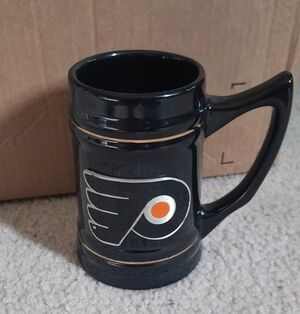 Black mug featuring the Philadelphia Flyers logo. Perfect for fans.