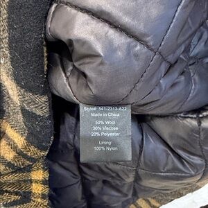 Wool blend jacket with quilted nylon lining. Minimal signs of wear. Black and orange plaid.