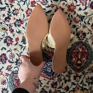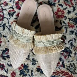 Elegant tan raffia mules by Michelle McDowell. Features stylish fringe detail. Slip on flat. Size 8.
