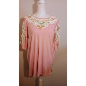 Vintage Lacy Afternoon Pink beaded Embroidered Floral Fringe Top Women's large