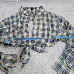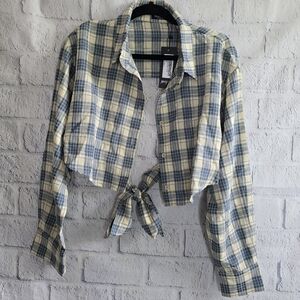 BRAND NEW Stylish plaid cropped shirt with a tie-front design. Features a mix of blue and cream colors.