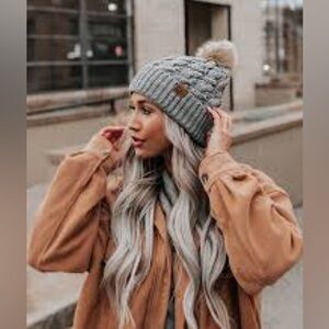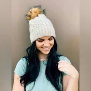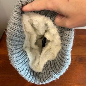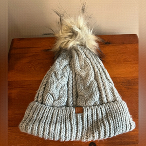 DAVID & Young Faux Fur lined Grey knit winter hat COZY! Pom Pom