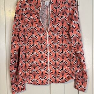 Vibrant coral athletic zip with striking navy and white pattern. Elegant design for versatile styling. New with tags (NWT). Stretch Material. Great for athletic activities- golf/ tennis