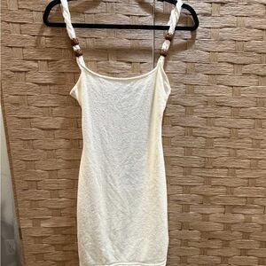 Stylish cream dress featuring beaded straps. Perfect for beach outings or summer events.