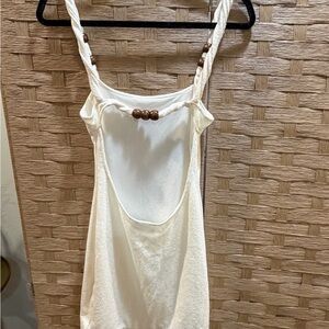 Embodying nightlife chic. The Sea Shells Mini Dress Off White features thick straps with bead embellishment and twisted detail, backless design, mesh lined, knitted fabric with high stretch for an easy slip on design and mini length. Pair it with platform flats and show off your glow!