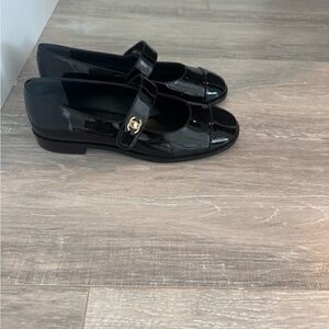 Sleek black patent leather Mary Jane flats. Features signature logo on strap. Chic and versatile style. A shoe that can take you from day to night. Can be worn dressy or casual. Brand new never worn purchased from Saks Fifth Avenue. Very comfortable in excellent condition from a smoke free home.