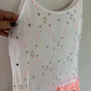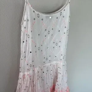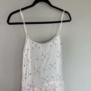 Features: Pullover Style, Adjustable spaghetti straps, Drop Waist, Tiered flouncy ruffle skirt, Silver mirror embellished accents, Lined, Scoop neckline, Ruffle hem, Geometric print with metallic accents, Allover mirror embellishments and tonal embroidery.