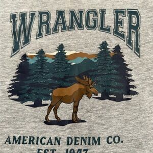 Wrangler T-Shirt Features a forest graphic with a moose. Size 2T Ideal for casual wear. I put Fair condition only because when tshirts shift sometimes it looks crooked.