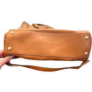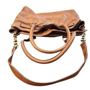 This Michael Kors satchel in a warm tan hue exudes elegance with its structured design and gold hardware accents. Crafted from high-quality leather, it offers a sophisticated look suitable for both casual and business settings. The bag's versatile color and timeless style make it a must-have accessory for any wardrobe.