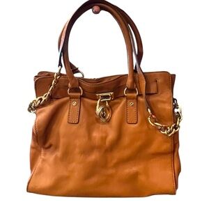 Michael Kors Hamilton Large Brown Leather Handbag Gold Logo Lock Chains Classic