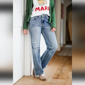 Size 13 NWT Judy Blues. 90's mid rise distressed straight leg jeans with a rigid front jean material and a stretchy back jean material. Absolutely love the fit on these. They are boutique sizing so a 13 fits more like a 14.