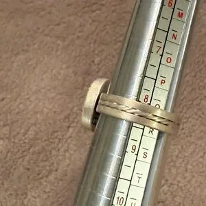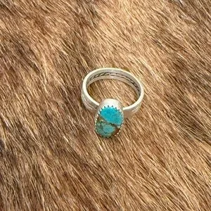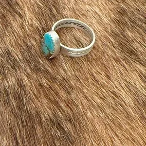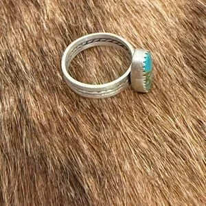 Number 8 turquoise ring set in matte sterling silver. Thick band with decorative stamping. Natural matrixes & inclusions are normal in natural turquoise. Size 8 1/4. Stamped sterling. Perfect for adding a pop of color to any outfit.
