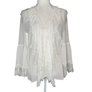 Alice + Olivia Jaden lace-paneled gauze tunic top in sheer white. Lightweight crinkled chiffon style fabric with delicate lace trim throughout including neckline, front panels, sleeves, and back yoke. Relaxed, flowy silhouette with long sleeves and scalloped lace cuffs. Romantic boho-inspired piece that layers beautifully over a cami or bralette.