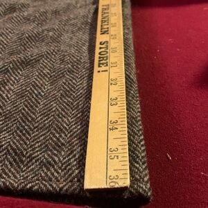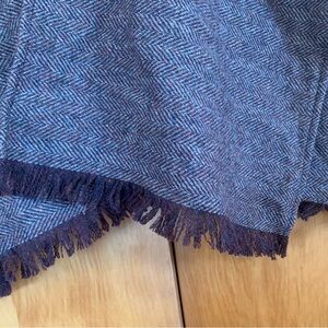 Gorgeous herringbone with blue, maroon and tan yarns woven into the predominantly chocolate brown and grey fabric. Brown fringe detailing. Perfect for layering over any outfit. This is in excellent condition with no pilling or wear, but the weavers tag is missing.