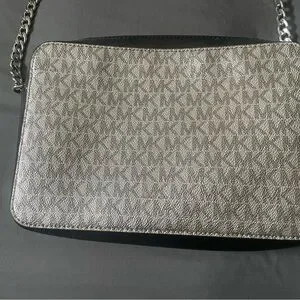 Elegant Michael Kors messenger bag in silver and black. Features a sleek design with chain strap.