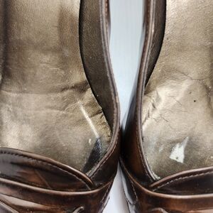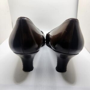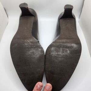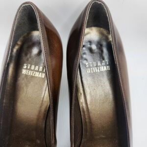 The product is a pair of vintage Stuart Weitzman women's leather pumps in a brown color, featuring a closed toe and a mid-height kitten heel. These slip-on heels are designed for comfort and are suitable for a career or professional setting. The classic penny loafer style adds a touch of sophistication to the solid brown color, making them a versatile and stylish choice for any wardrobe. Some signs of wear (see photos)