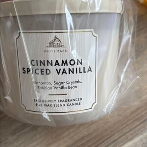 New and wrapped, ready for a gift. Cinnamon spiced vanilla white barn candle and kitchen lemon foaming hand soap both from bath and body works