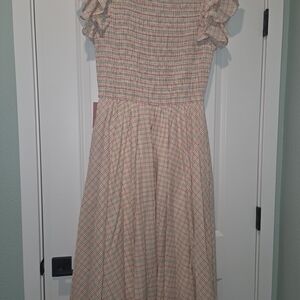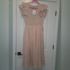Charming dress with ruffle sleeves. Features a delightful pink plaid design. Perfect for casual wear.