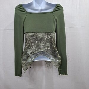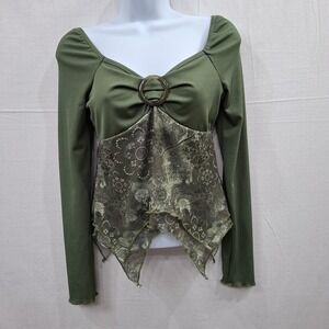 Y2K Babydoll Top XS Green Paisley long Sleeve Fairy Grunge Goblincore Asymmetric