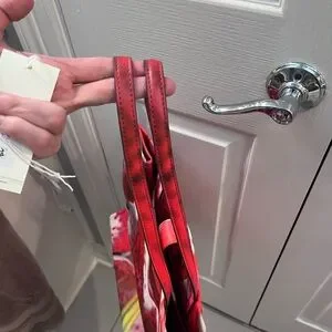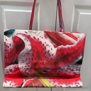 Vibrant floral tote bag in striking red. Perfect for adding a pop of color to any outfit. Recycled nylon. Height 13”, Length 17.1”, Width 5.1”, Top handle drop 9.8”. Will hold 17” laptop. Hidden exterior pocket.