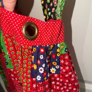 Vibrant patchwork maxi dress with a sleeveless design. Features a mix of red, green, and black patterns. 100% cotton. Shoulder to hem 56 inches. Waist is adjustable. Two pockets in the front. Vibrant colors. No holes are damaged.