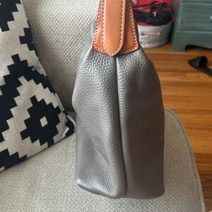Authentic Stylish classic baby soft gray leather shoulder bag by Dooney & Bourke. Features a pebbled textured finish.