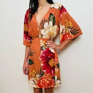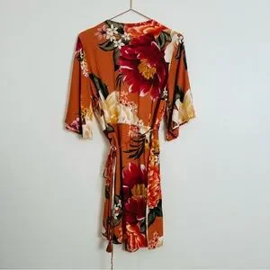 This dress is a burnt orange floral print wrap mini dress with a V-neck and short, flared sleeves. It features large white and red floral patterns with green leaf accents, and appears to be a true wrap style with a tie closure at the waist, ending in small tassels.