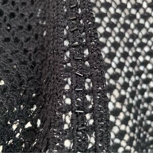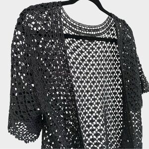 Stylish black crochet cardigan with open-front design with beaded accents. Perfect for layering.