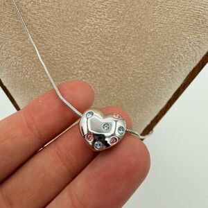 Excellent condition heart necklace by Swarovski. One side is solid color crystal accents. The other side has pink and blue polka dot crystals. Appx 16" in length.