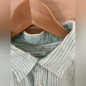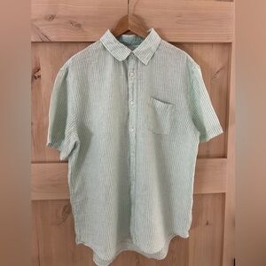 Classic Panama Jack Men’s linen button-down with aqua/white stripes. This 100% linen shirt is in great condition, a perfect spring and summer staple, very versatile and great for layering. Fantastic vacation piece, very airy and breathable. Size XL.