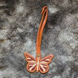 Add a touch of elegance to your accessories with this orange butterfly leather keychain. Perfect for adding a pop of color to your bag or keys.